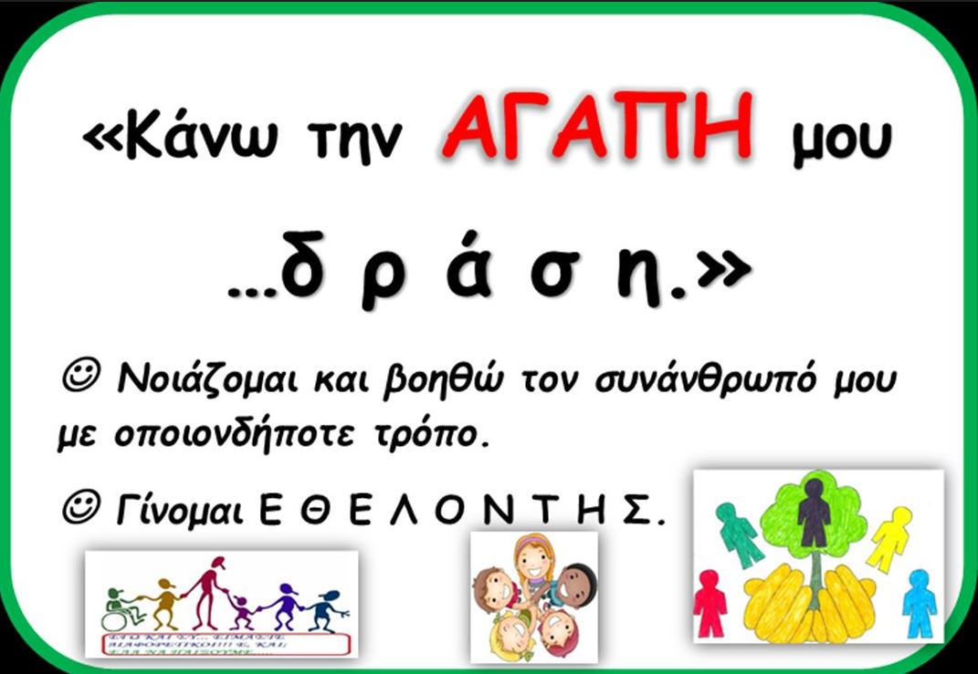 Δεκέμβριος, μήνας γιορτινός, μήνας αγάπης και προσφοράς! Για τον λόγο αυτό και ο στόχος του σχολείου μας για αυτή την περίοδο είναι "ΚΑΝΩ ΤΗΝ ΑΓΑΠΗ ΜΟΥ... ΔΡΑΣΗ." Μέσα από μικρές, καθημερινές πράξεις καλοσύνης γινόμαστε εθελοντές, βοηθάμε, δείχνουμε την αγάπη μας με οποιονδήποτε τρόπο....
